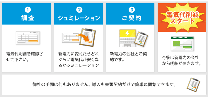 1ステップ目⇒現在の電力会社様とのご契約を見直し、電気料金単価を下げるご契約をご提案します。