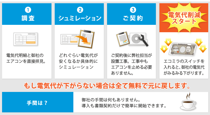 2ステップ目⇒ほとんどの施設で、空調(エアコン)の電力が高い為、エコミラを使って電力量を下げ、電気代を削減します。 - Q導入前と導入後に手間はかかりますか?